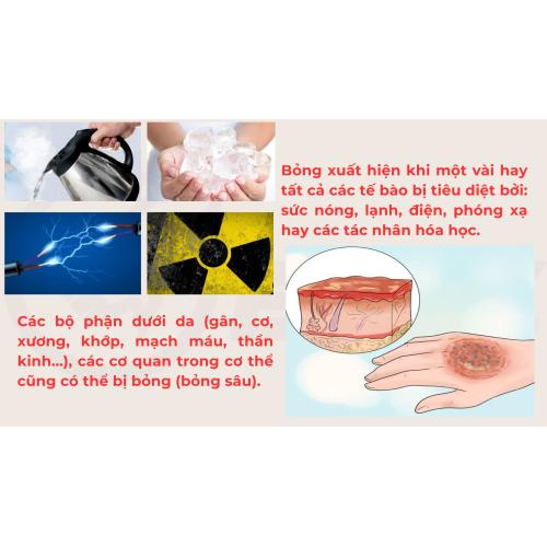 Bỏng do hoá chất: do các chất acid, chất kiềm mạnh, chất ăn mòn, chất gây độc cho nguyên sinh chất...