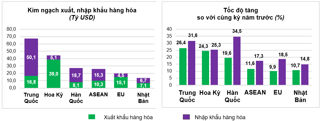 Thị trường xuất, nhập khẩu hàng hoá chủ yếu quý I năm 2026Về thị trường, Hoa Kỳ tiếp tục là thị trường xuất khẩu lớn nhất với kim ngạch 39,0 tỷ USD, trong khi Trung Quốc là thị trường nhập khẩu lớn nhất với 50,1 tỷ USD. Trong quý I, Việt Nam xuất siêu sang Hoa Kỳ 33,9 tỷ USD, tăng 24,2%; xuất siêu sang EU 10,6 tỷ USD, tăng 6,6%; xuất siêu sang Nhật Bản 0,4 tỷ USD, giảm 28,4%. Ở chiều ngược lại, nhập siêu từ Trung Quốc đạt 33,3 tỷ USD, tăng 34,4%; từ Hàn Quốc 10,6 tỷ USD, tăng 48,7%; từ ASEAN 5,0 tỷ USD, tăng 31,3%.