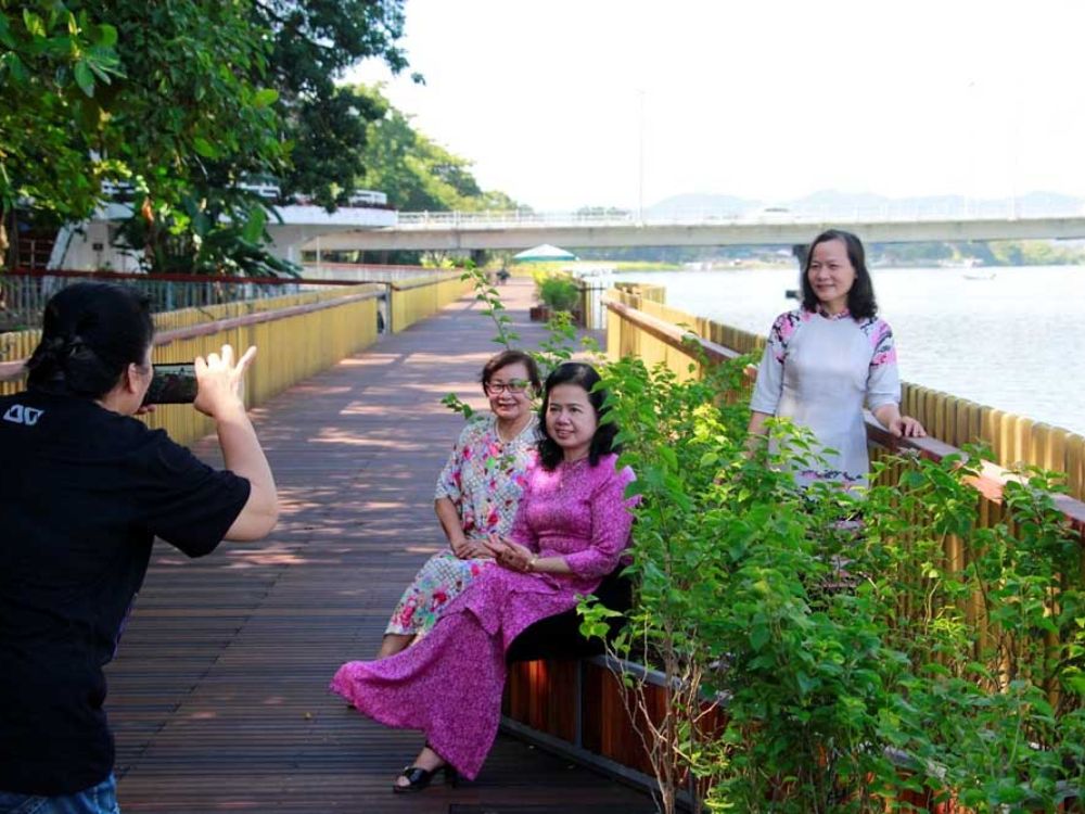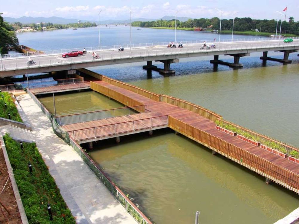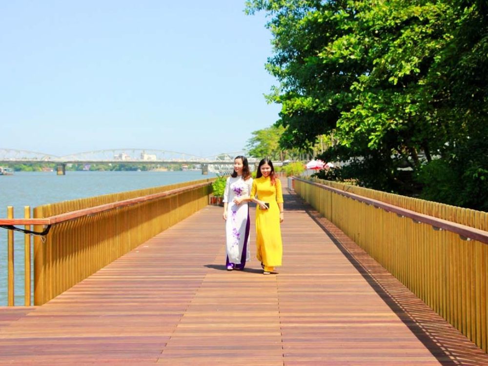 Sau hơn 8 tháng thi công tuyến đường đi bộ lót sàn gỗ lim dài hơn 380 m ven sông Hương đã hoàn thành và đưa vào sử dụng với mục đích tạo điểm nhấn cho bờ Nam Sông Hương.