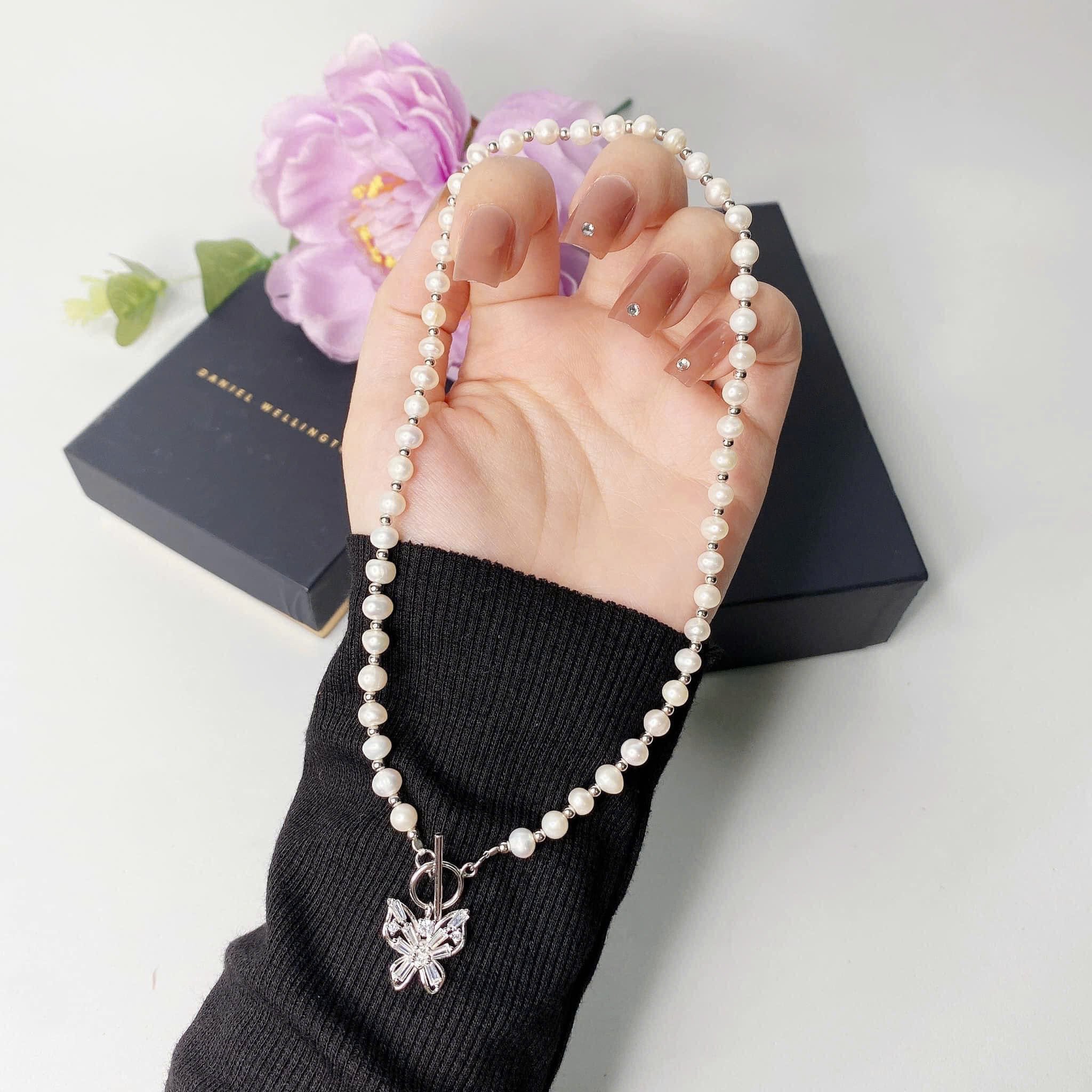Vòng được thiết kế theo phong cách choker đeo sát cổ, kết hợp cùng ánh xà cừ lung linh phản chiếu qua từng viên ngọc trai. Điểm nhấn là khóa hình con bướm cùng bi bạc 925 xi bạch kim hoặc mạ vàng, tạo lớp phủ sáng bóng, bền đẹp theo thời gian. Thiết kế này không chỉ gia tăng vẻ sang trọng, quý phái cho sản phẩm mà còn tôn lên vẻ đẹp tự nhiên của ngọc trai, làm nổi bật nét dịu dàng và nữ tính của người đeo.