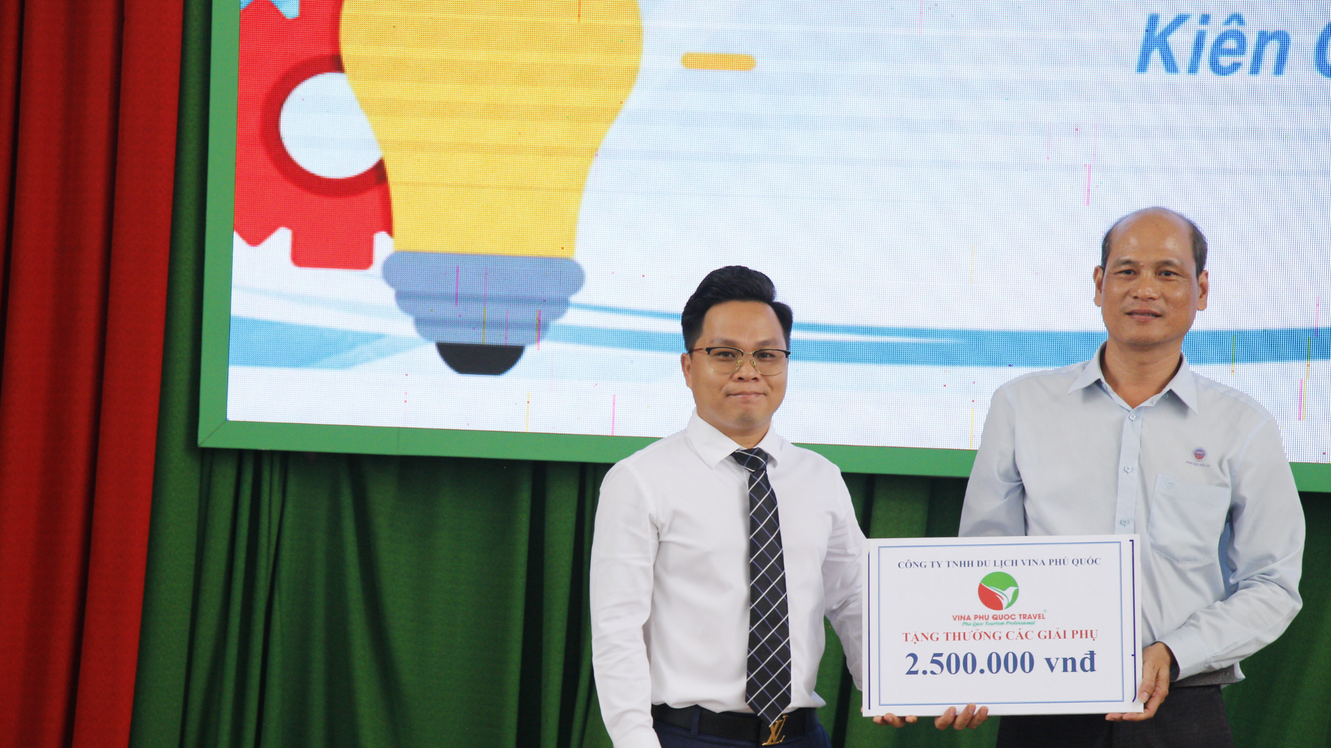 Ông Nguyễn Văn Phục - Giám đốc Công ty Cổ phần Giáo dục Hiền Nhân trao biểu trưng tài trợ 15.000.000đ cho hội thi.